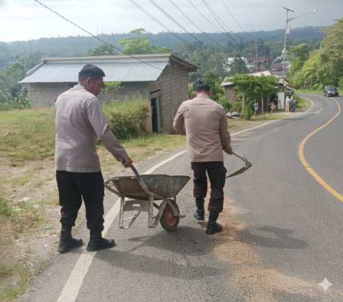 Petugas langsung menaburkan pasir yang diambil dari lokasi sekitar menggunakan lori (angkong) dan peralatan sederhana. Langkah ini dilakukan untuk mencegah jalan licin dan mengurangi risiko kecelakaan, terutama bagi pengendara sepeda motor.